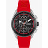 BOSS Gents Watch from the Volane family. With a 44 mm stainless steel case, a red silicone strap with an embossed logo, and a black sun-ray dial with red accents. 5 ATM of water resistance.