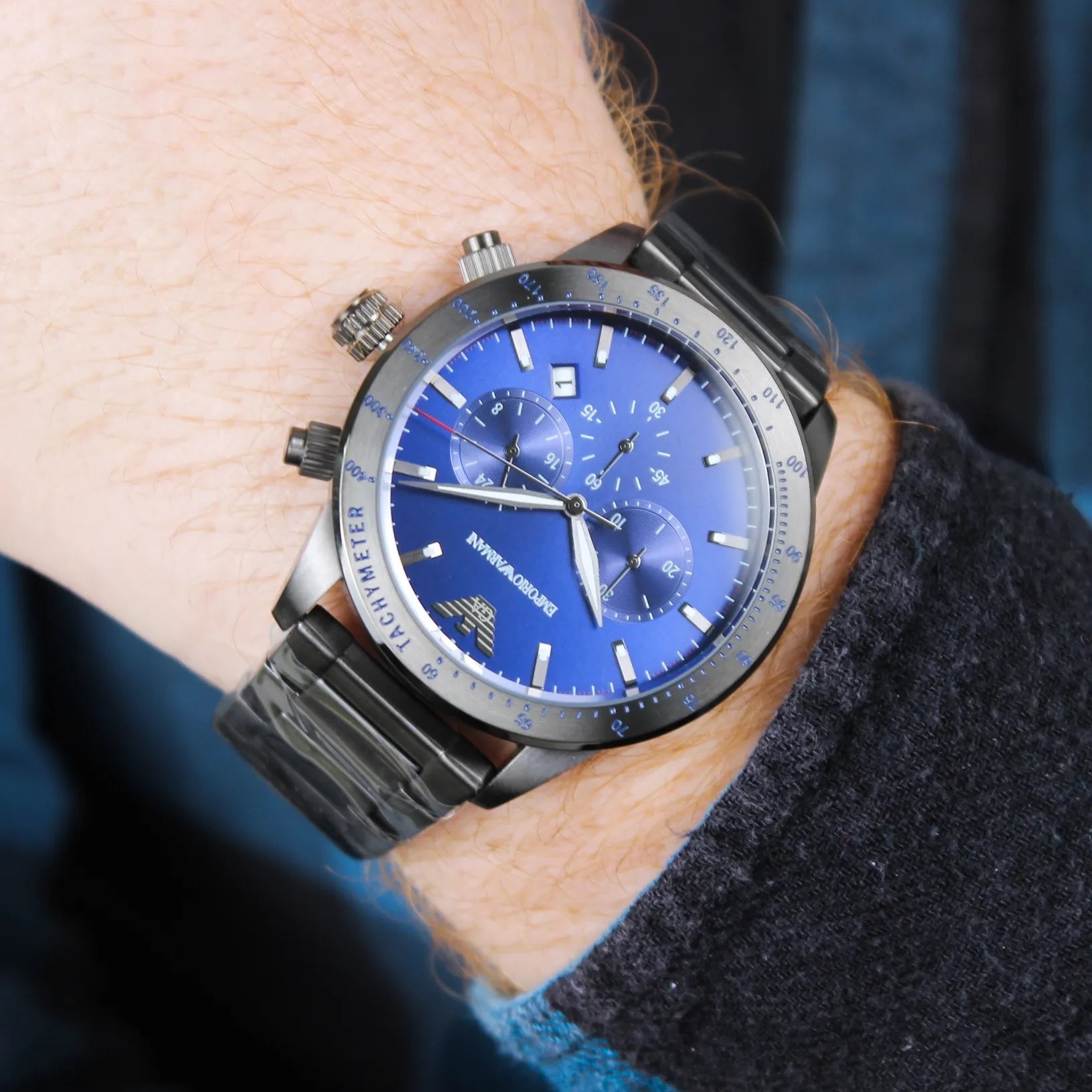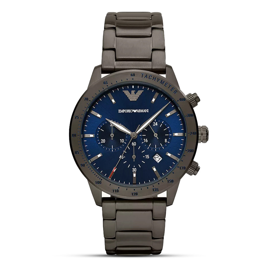 Indulge in the timeless sophistication of the Emporio Armani Chronograph Gunmetal Blue Dial Men's Watch. This luxurious timepiece boasts a sleek gunmetal finish and a striking blue dial, exuding an air of exclusivity and refinement. With precise chronograph functionality, this watch is both elegant and practical.