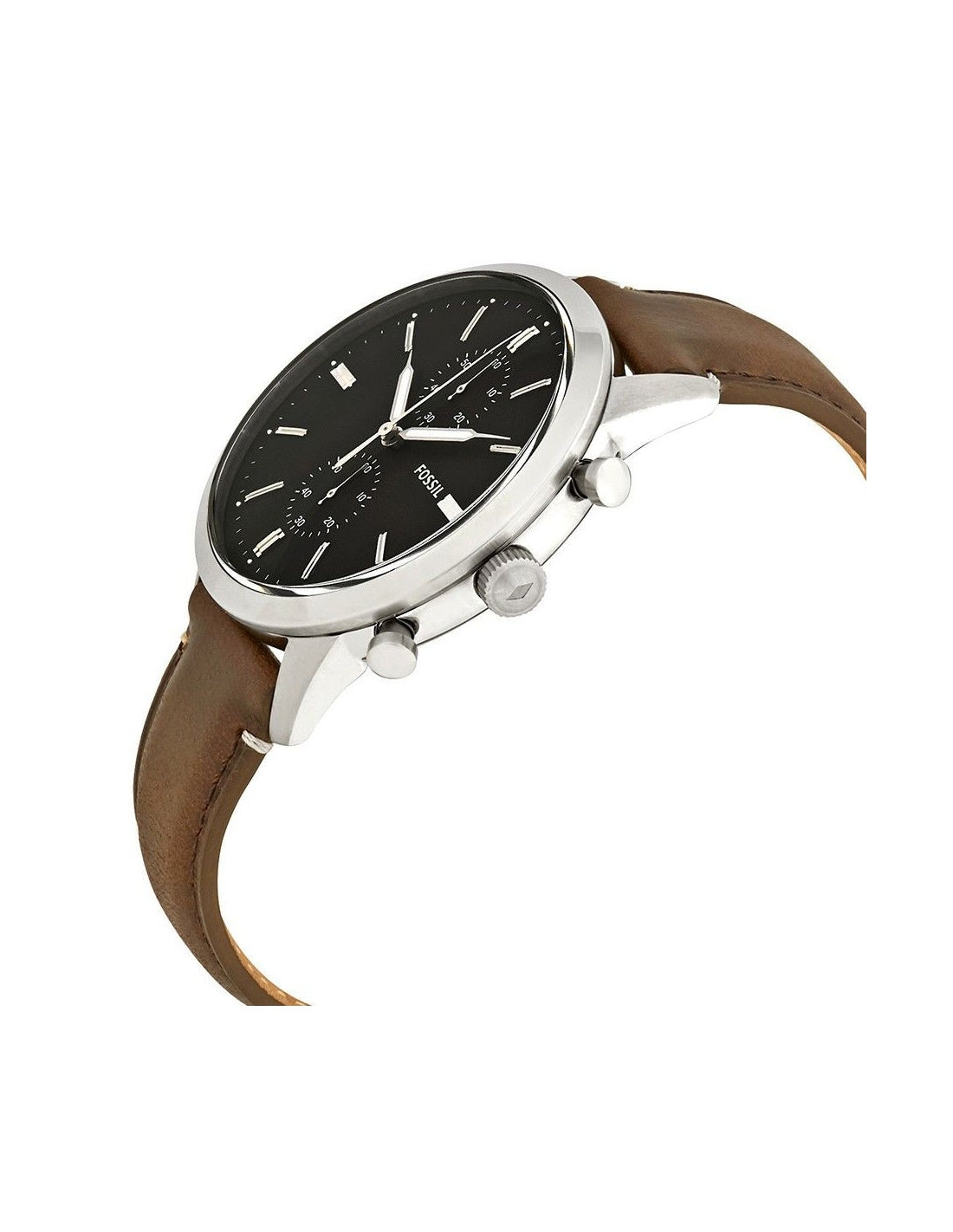 The Fossil Townsman Chronograph Brown Watch features a 44mm case with a black dial, rose gold-tone markers and hands, and three chronograph subdials. Water-resistant for up to 30m, this watch maintains optimal accuracy in any aquatic environment. Silver-tone stainless steel casing and brown genuine leather strap complete the look.
