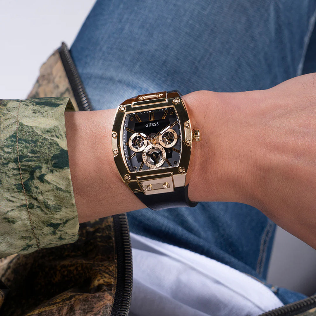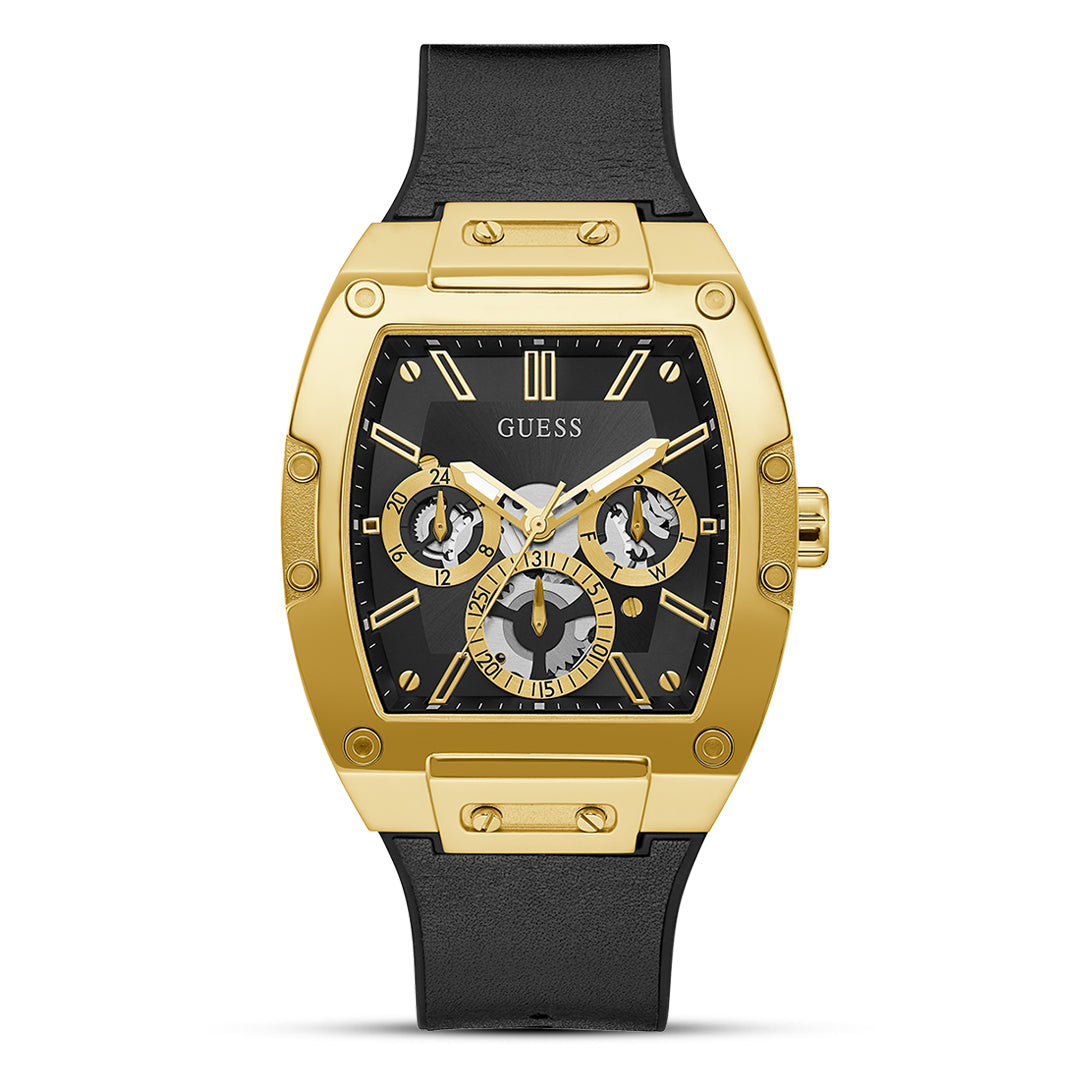 Introducing the Guess Black and Gold-Tone Square Multifunction Men's Watch! This watch is the perfect blend of style and functionality. With its sleek black and gold design, this watch will elevate any outfit. Keep track of time with ease and make a statement with this must-have accessory.