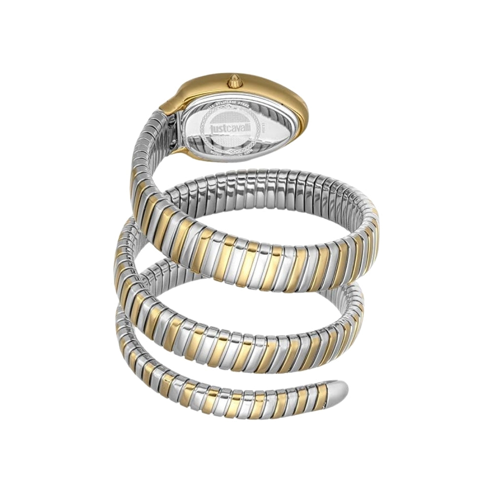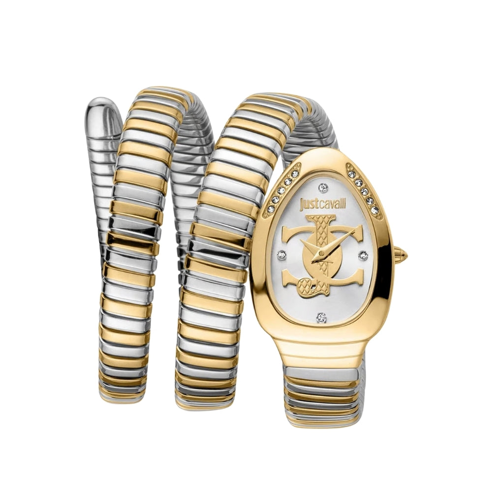 Make a bold statement with the Just Cavalli Signature Snake White Dial Ladies Watch. Featuring a striking white dial and the iconic snake motif, this timepiece blends daring design with elegant craftsmanship. Perfect for those who want to stand out, it adds a fierce edge to any outfit while keeping precise time. Embrace your fearless style with this unforgettable accessory.