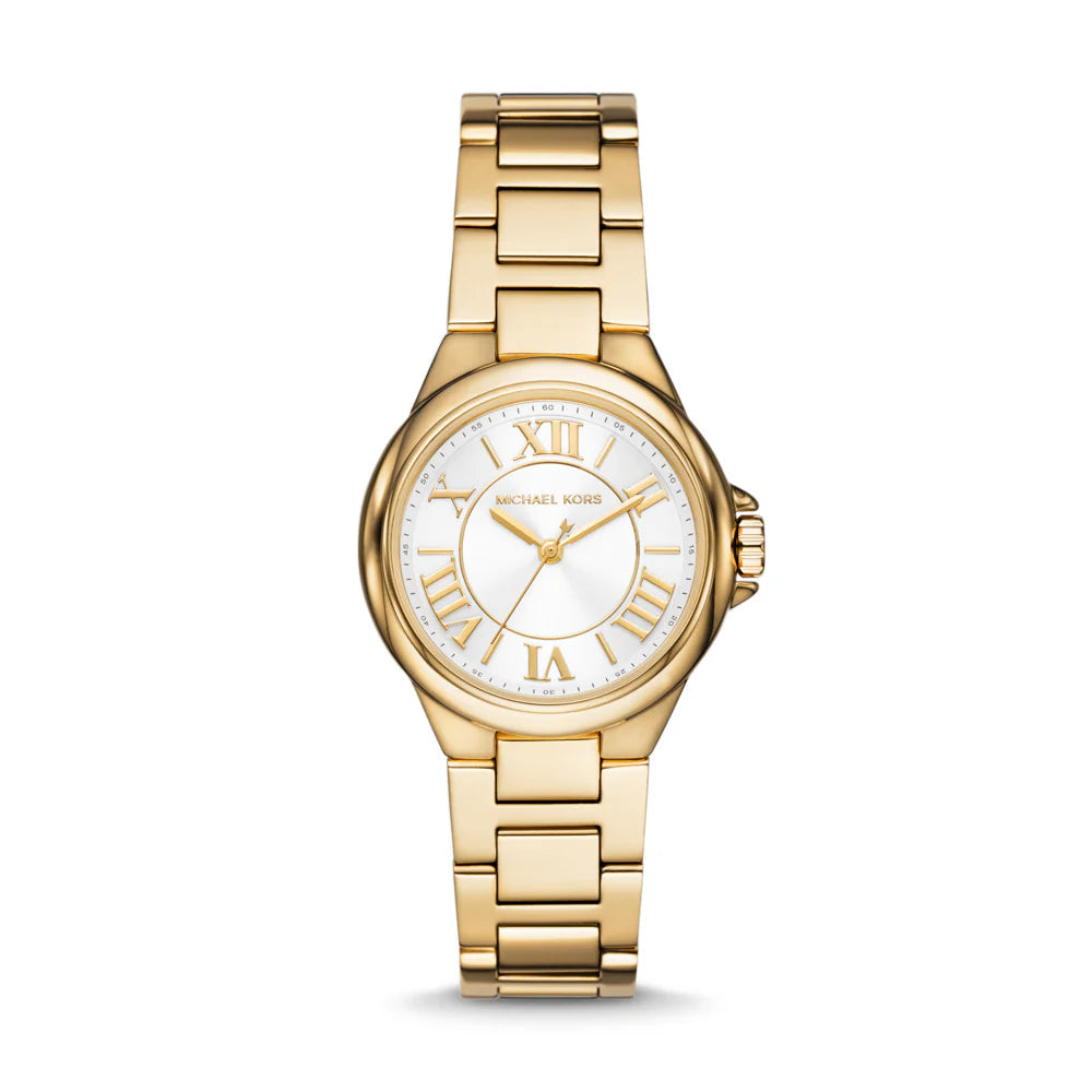Indulge in timeless elegance with the Michael Kors Camille Watch. The gold tone and white dial effortlessly exude luxury and sophistication. Perfect for the woman who appreciates classic beauty.