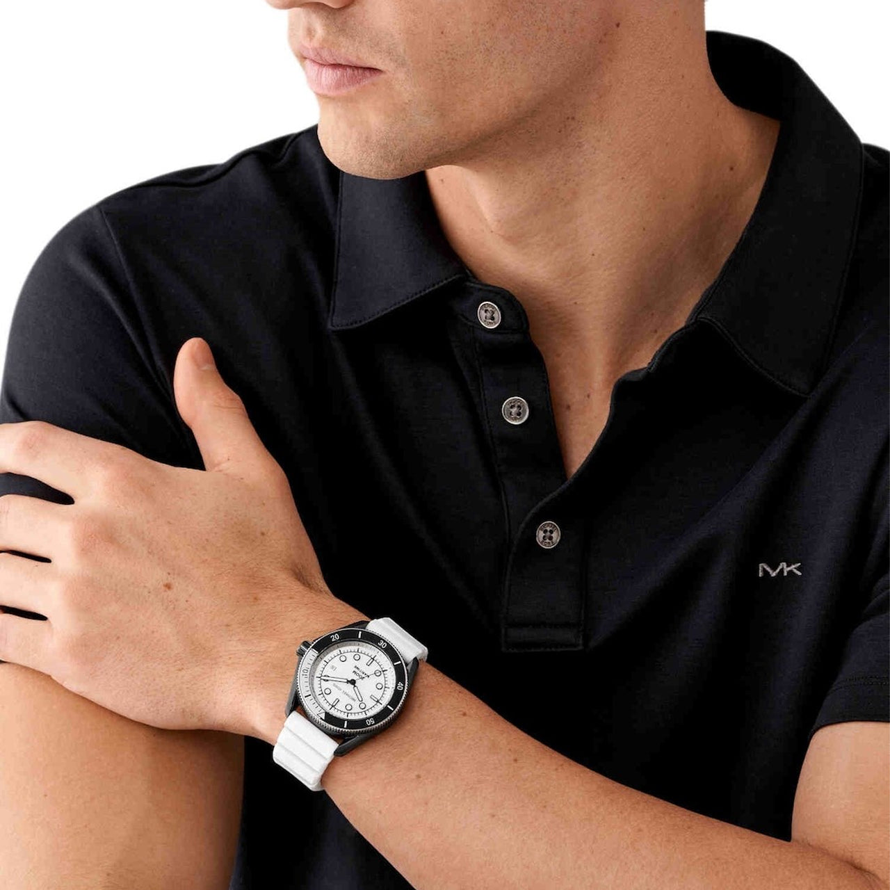 The Michael Kors Maritime watch boasts a crisp white dial and a durable silicone band, making it the perfect accessory for any man's wardrobe. With its sleek design and expert craftsmanship, this watch guarantees both style and function.