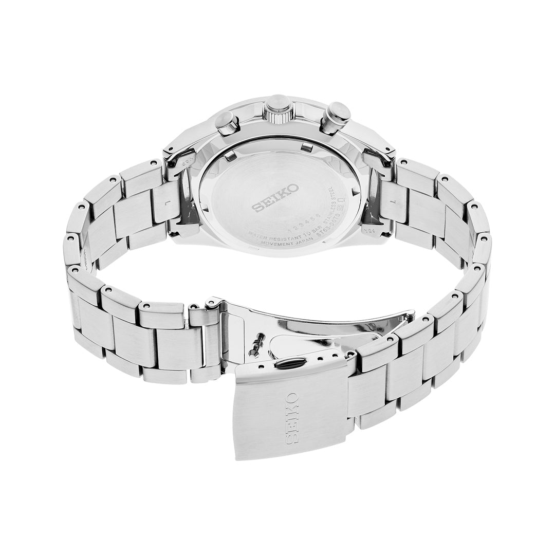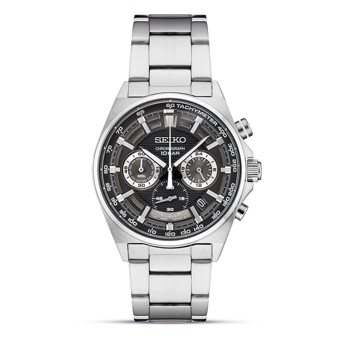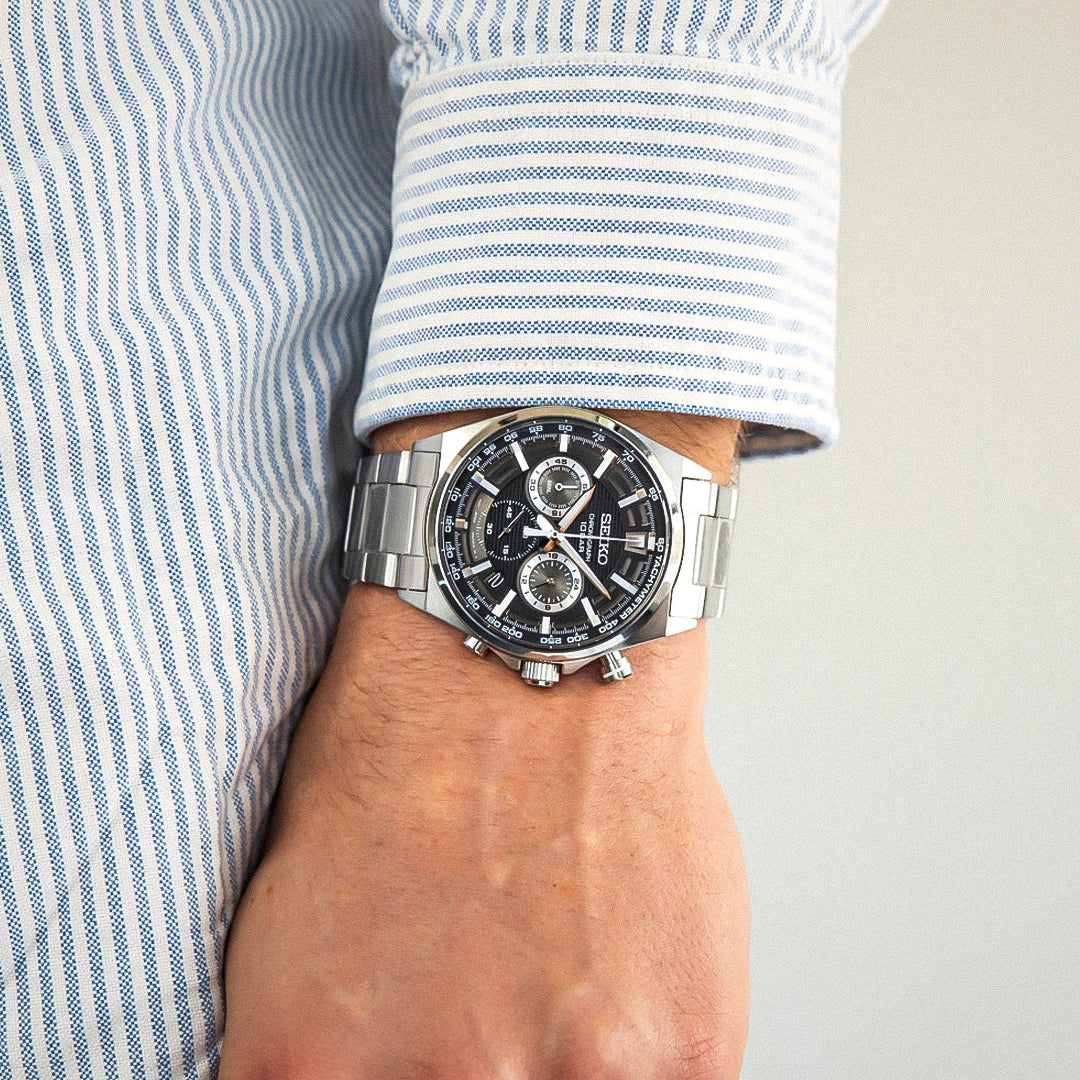 Tick-tock in style with the Seiko Essentials Chronograph! This dashing black-dialed companion isn't just another pretty face—it's your wrist's new best friend. With its snazzy chronograph features and that unmistakable Seiko quality, you'll be checking the time just for fun.