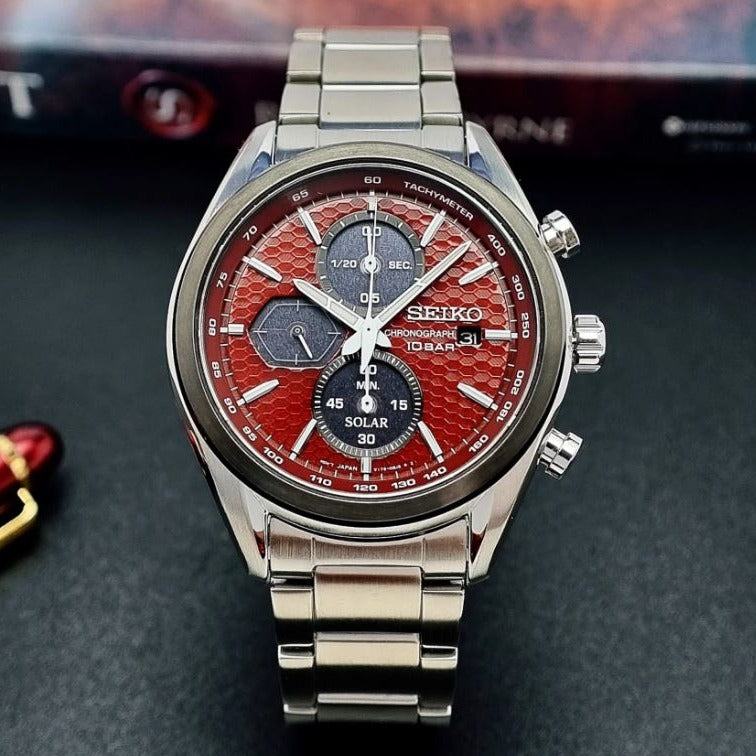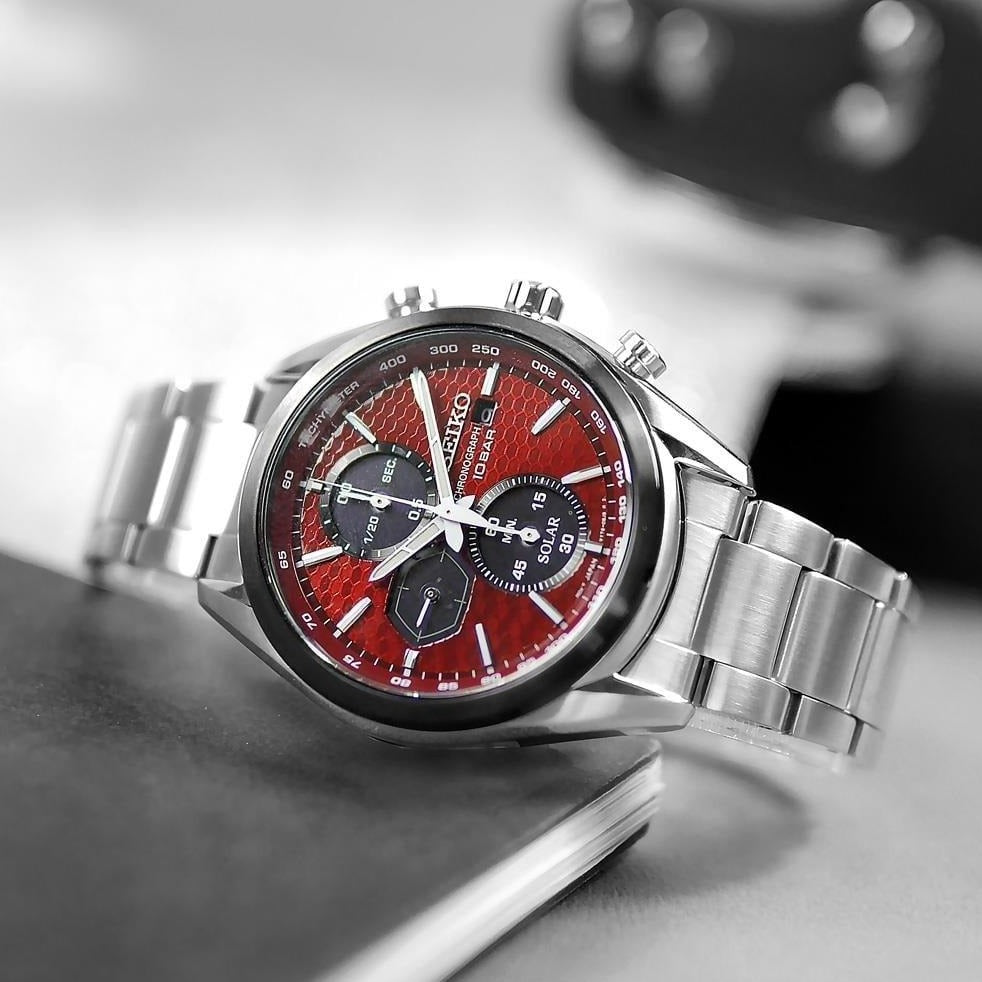 SEIKO delivers with this impressive Chronograph Quartz Red Dial Men's Watch. With striking red accents, an easy-to-read dial, and 100-meter water resistance, this watch is perfect for any active lifestyle. The quartz movement ensures optimal accuracy and reliability, so you can count on it no matter where you go.