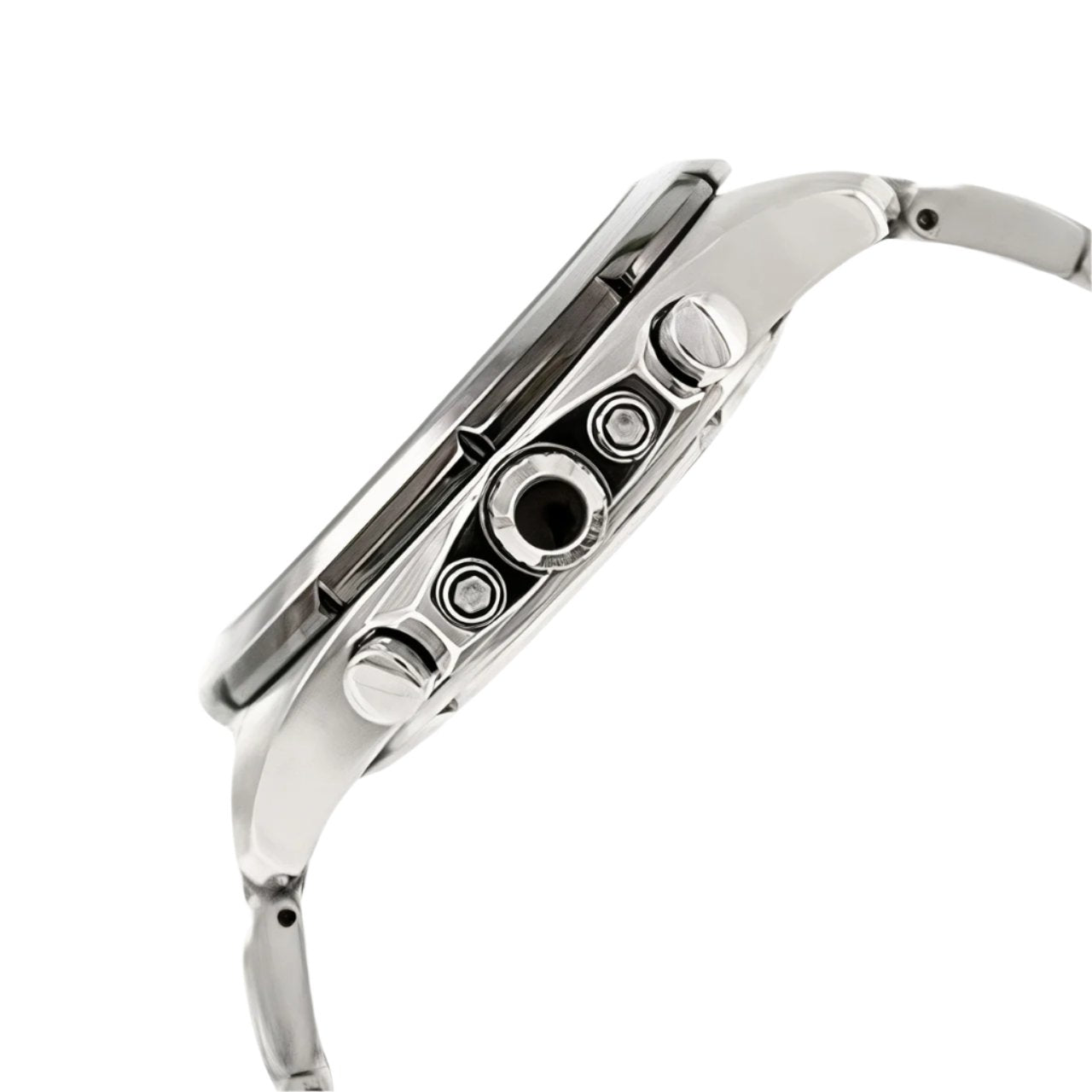 • Case Diameter: 45 mm, Case Thickness: 13 mm, Case Material: Stainless Steel, Clasp: Fold over clasp, Dial Glass: Hardlex, Case Colour: Silver