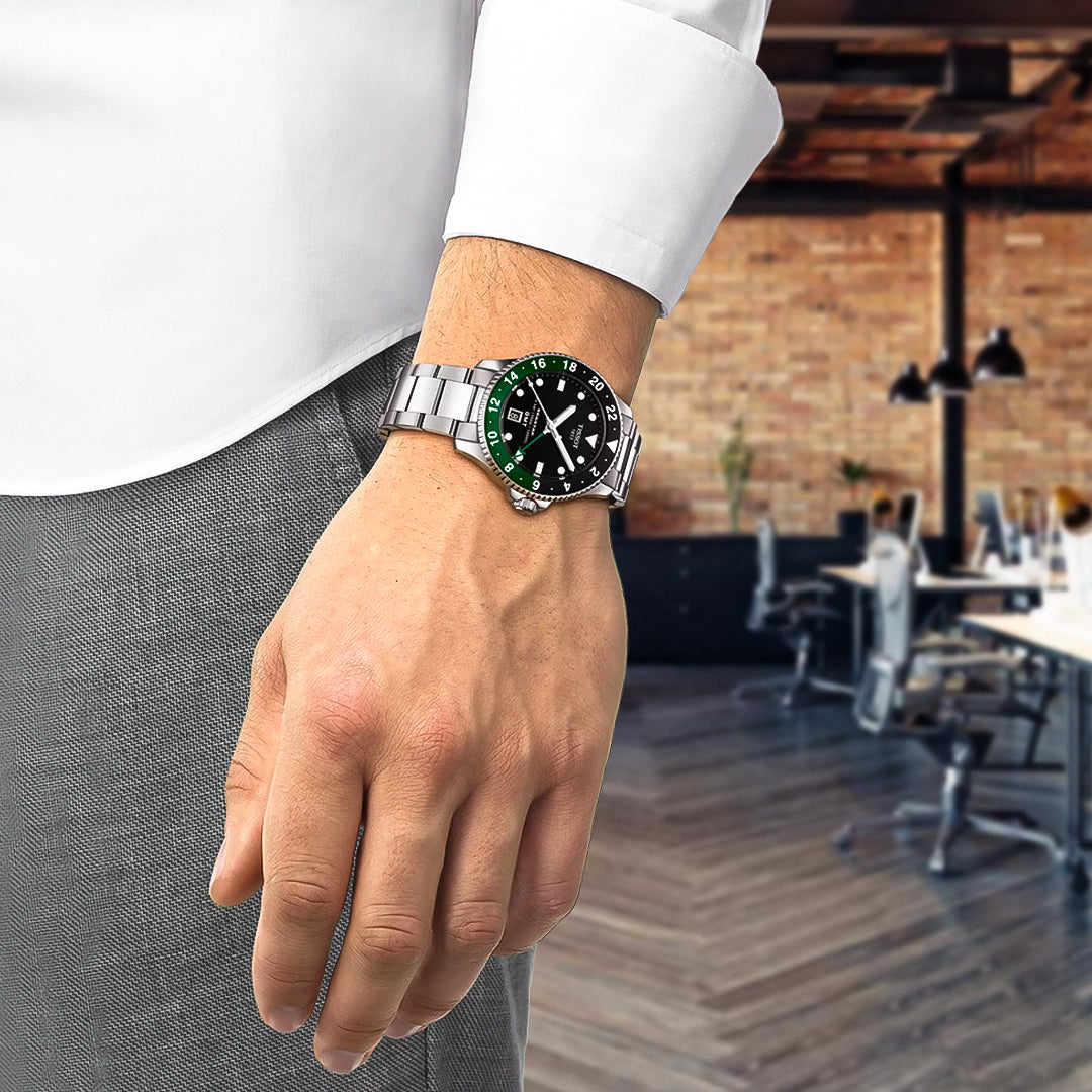 - Band Material: Stainless Steel, Band Color: Two Tone Grey, Bezel Material: Stainless Steel, Bezel Color: Black/Green, Band Width: 20 mm.