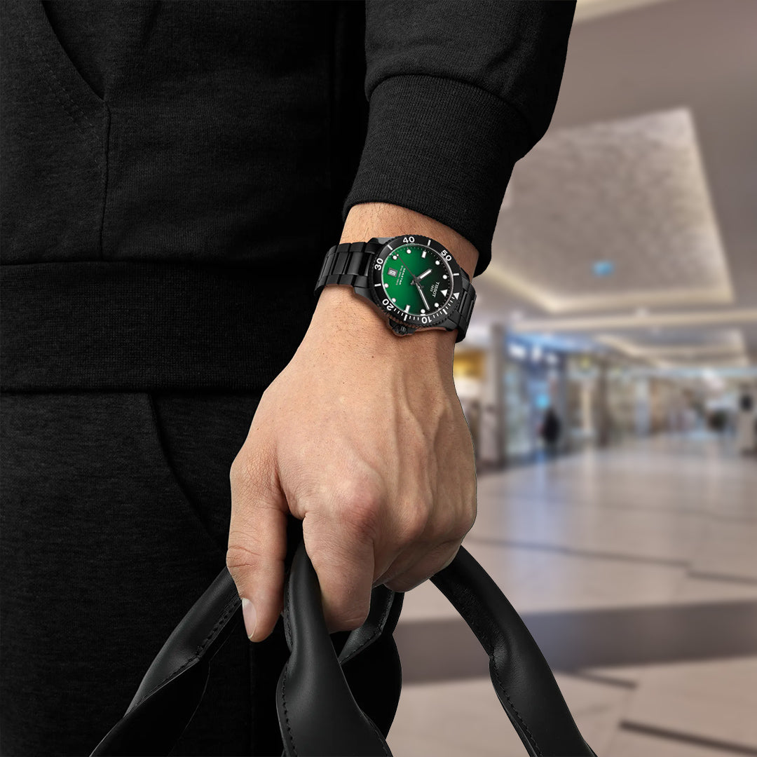 The TISSOT Seastar 1000 40mm Green Dial Men's Watch offers reliable performance and enduring style. Designed with a robust stainless steel case and water resistance up to 300 meters, it supports your active lifestyle both on land and underwater.